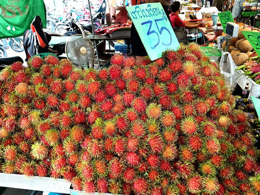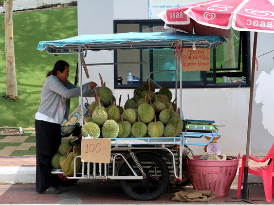 Eigentlich wollten wir noch eine Nacht in Chantaburi bleiben, aber die Stadt machte auf uns so keinen einladenden Eindruck, was sicher auch am Regen gelegen haben könnte. Chantaburi ist die Obstregion des Landes und überall am Strassenrand und auf Märkten wir jede erdenkliche Frucht verkauft.