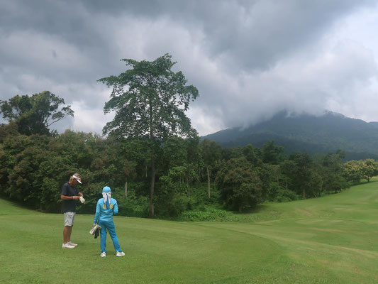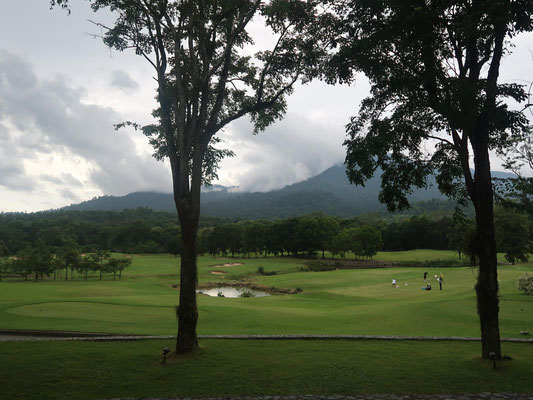 Gestartet hier bei strahlendem Sonnenschein, erreichen wir das Hotel bei Regen. Der Berg absolut in Wolken. Trotzdem konnten wir 2 Runden Golf fast trocken spielen.